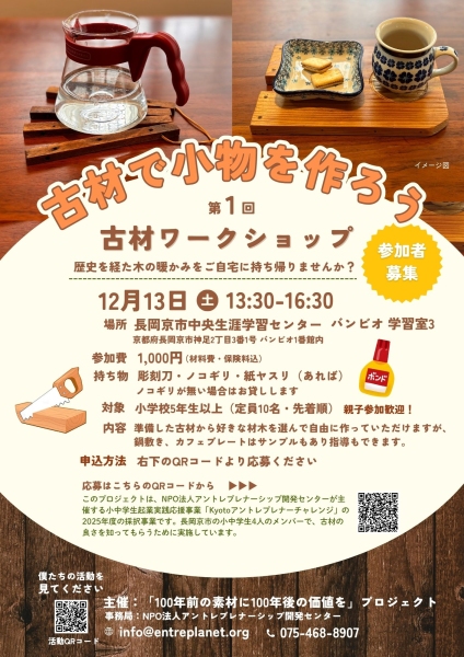 商品説明:12月13日に長岡京市中央生涯学習センターで古材をつかったワークショップを開催します。 よかったら来て下さい