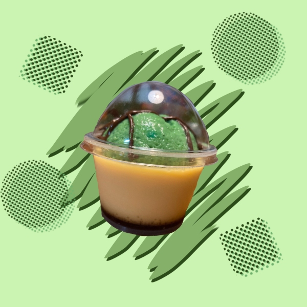 商品説明:亀岡の牛乳を使って作ったプリンです。 上のクリームは亀の甲羅になっています。