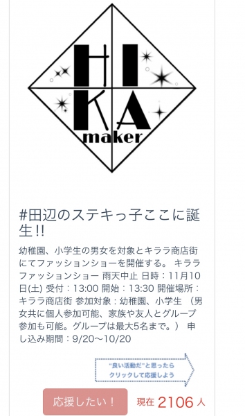 由来は、京田辺市を古典的な街から現代的な街へ変える、という部分からとりました。古語で「キラキラ輝く」は「ヒカメク」という意味なので、その言葉にキラキラ輝かせる人という意味のmakerをつけました!