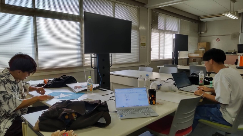 夏休み中ですが進捗を上げるためにメンバーみな大学へ集まり紙芝居作成に入りました。