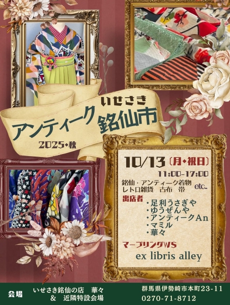 次回は10/13 提携企業様である伊勢崎銘仙の店 華々-HANABANA-にて「アンティーク銘仙市」を予定しています。