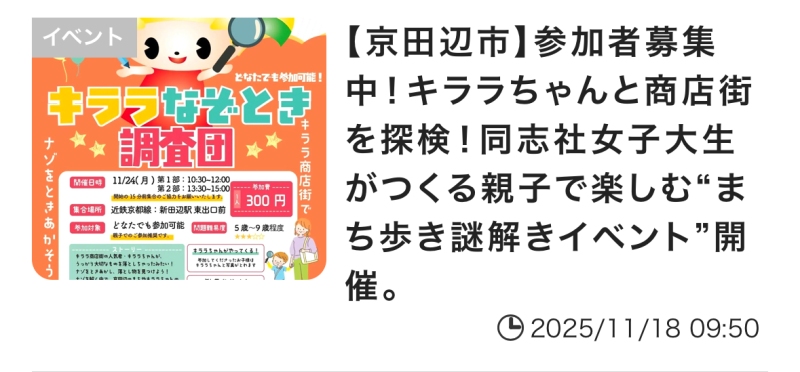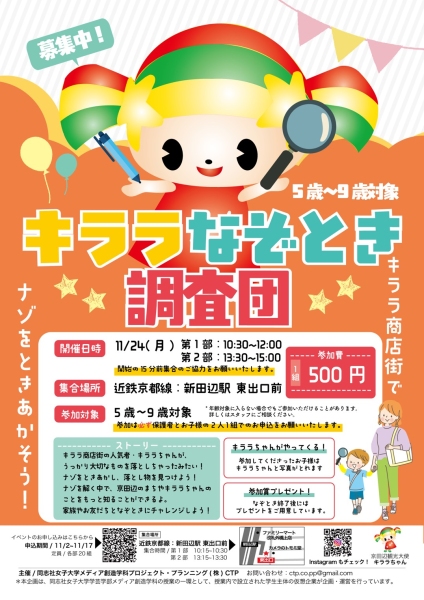 【京田辺市】参加者募集中!キララちゃんと商店街を探検!同志社女子大生がつくる親子で楽しむ“まち歩き謎解きイベント”開催。
