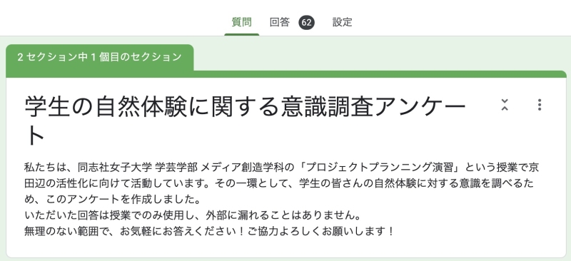 学生向けの自然体験イベントを企画するにあたり、まずは「学生のみなさんが自然にどんなイメージを持っているのか」「どんな体験を求めているのか」を知るためにアンケートを実施しました。