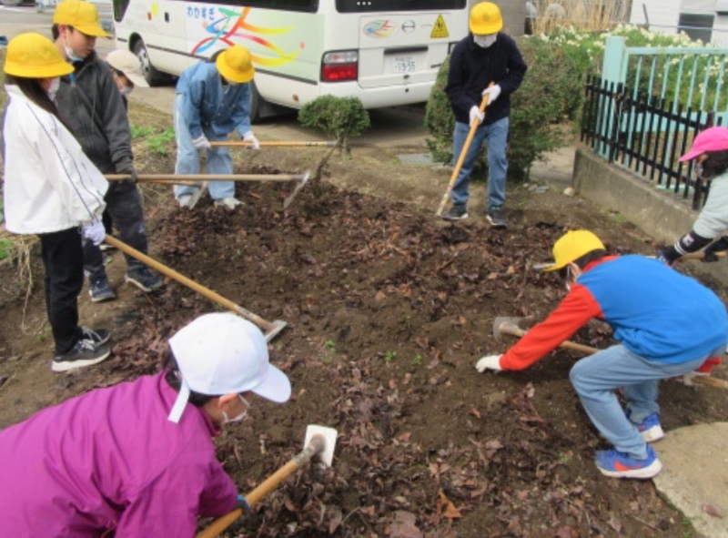 みんなで畑に行って土づくりをしました。竹炭と落ち葉を入れて土づくりをしました。土と竹炭、落ち葉を混ぜました。みんな、混ぜるのが大変そうでした。