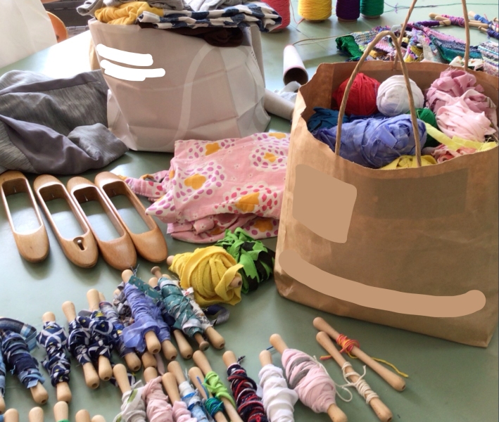 はたおりをする活動は、なんとSDGsの活動に繋がるのです!はたおりは主に糸を使って作りますが、私たちは、みなさんが着なくなった服(古着)を使って、はたおりをしています。古着を細長く切って布をおっていきます。古着を使うと服のぶんのゴミがなくなるのでSDGsに繋がります。