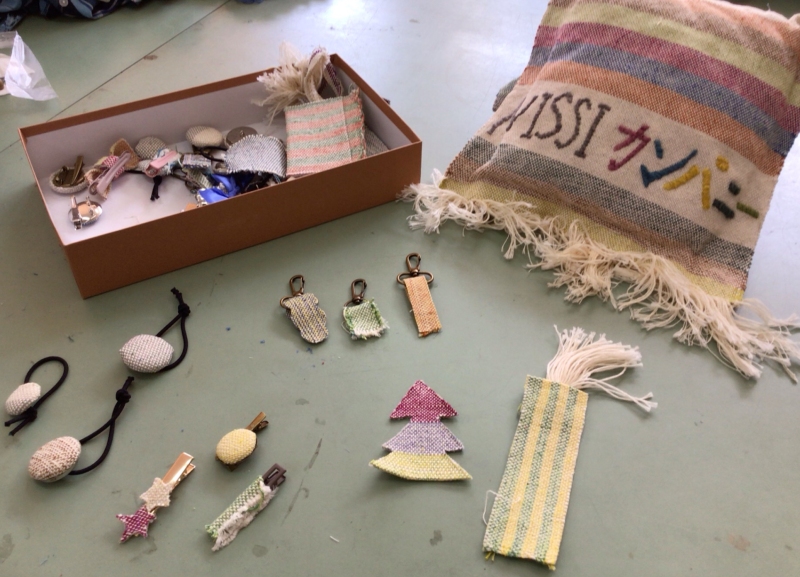 去年は、はたおりの商品は、布の配布と作品の展示しかありませんでしたが、今年は、はたおりの布で作ったヘアゴムや、ブローチなどを販売する予定なので、ぜひお買い求めください。