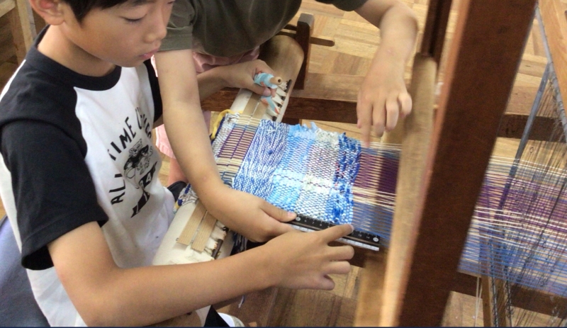 はたおりとは、機織り機という機械で糸を編んでいき、布にすることです。はたおりは、主に3・4年生が頑張って作ってくれています。