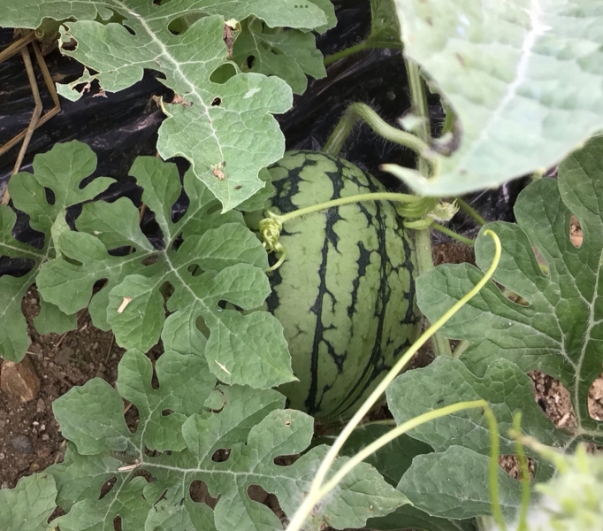 5月に植えたスイカが7月に実りました。用務員さんが「もう少しでと取れるよ。」と言ってくださった翌日には、動物に食われていました。みんなはショックを受けていましたが、幸いまだ収穫出来そうな大きなスイカがあったのでよかったです。
