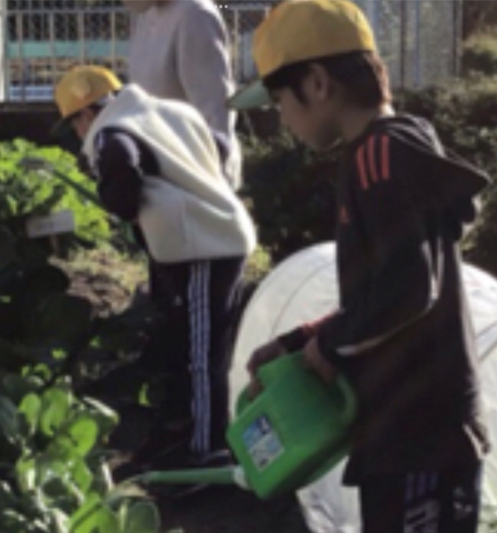 僕たちは野菜を植えた後に、学校に着いたら全校で曜日を分担して水やりをしています。野菜を商品として売ったり食べたりするために、日々頑張っています!
