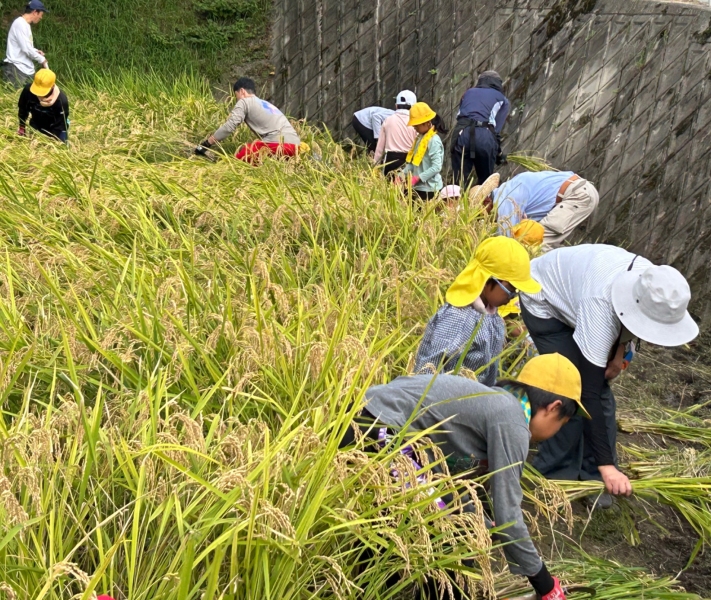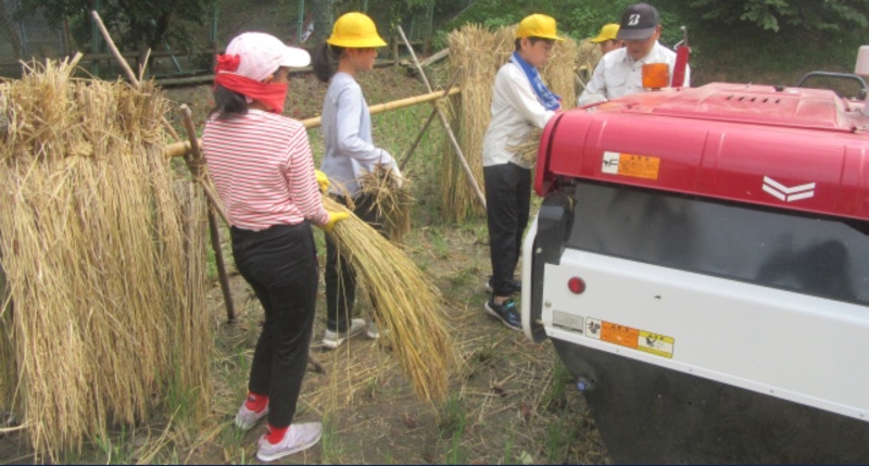 僕たちは9月19日に稲刈りをしました。山の自然子ども園別院の子どもたちにも手伝ってもらってたくさんの稲を刈ることができました。やっている時にとても暑かったけれど、みんなで頑張って刈ることができました。