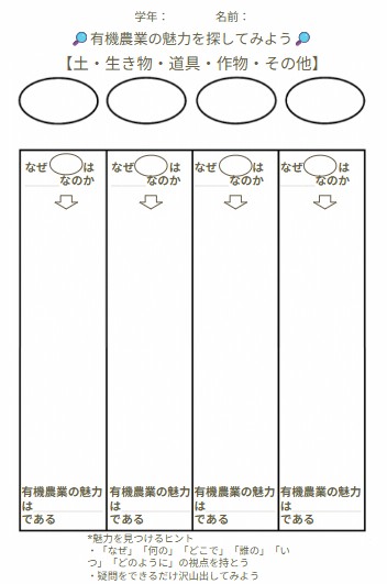 なぜの深堀では、フィールドワークで見つけた当たり前の疑問から気づいたことの中から特に疑問に思ったことを選び疑問の答えを見つけ、その答えからさらに疑問を探し、答えを見つけるという工程をワークシートを使用し何度も繰り返し行い、有機農業の魅力を発見しました。