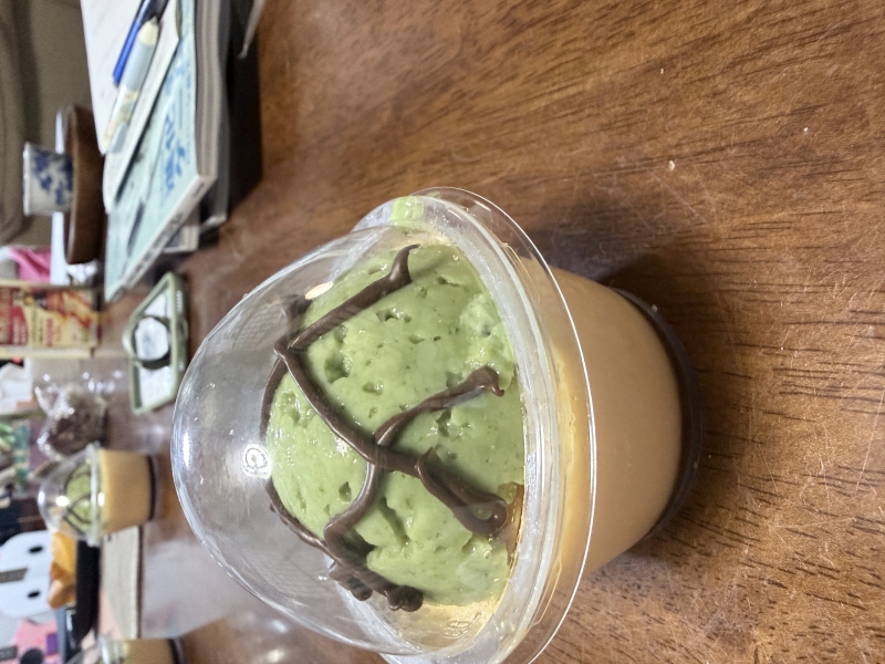 プリンのカラメルが上にあるせいでカラメルの色が混ざって変な色になってしまいました。