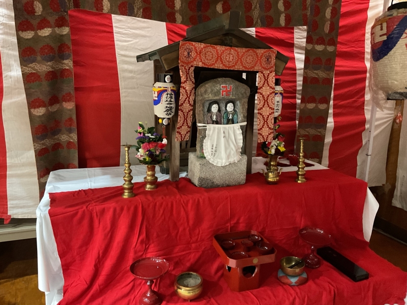 地域の方々の手厚い協力の下、地蔵盆内でも、お地蔵さんや紅白幕などの設置やパネル展示など、伝統を伝えていけるブースを設けられました。
