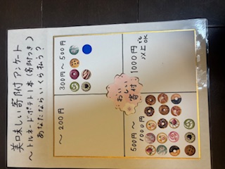どんなアンケートがいいかな。トルネードポテトのトッピングのアンケートはどうかな、などなどいろいろ考えたけれど、次の出店の時の参考にしようと思って、「トルネードポテト一本(寄付つき)あなたならいくら払う?」というアンケートを行った。