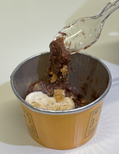 本商品は片手で持てるサイズのカップに入った生チョコです🍫パッケージ内には砂糖をまぶしたパイ生地が付属しています🥧生チョコにはやまといもを使用しているため、粘り気によるモチモチ感とすりおろしたやまといものシャキシャキ感の両方が感じられます🤩このまま食べることでその新しい食感を最大限に楽しむことができます!さらに、パッケージに付属している砂糖をまぶしたパイ生地をお好みで砕いて振りかけることで自分好みの甘さにすることや、サクサクとした食感をアクセントとして加えることができます✨そして、本商品に使用しているやまといもは群馬県太田市で作られているもので地産地消にも貢献しています🌎