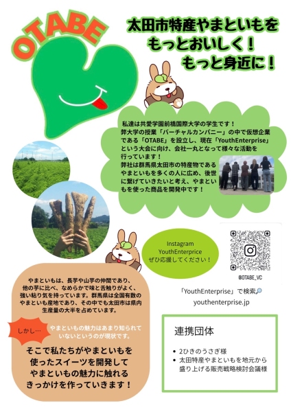 弊社は、太田市特産のやまといもを使用したスイーツを開発し、多くの若者に食べてもらうことでやまといもの新たな消費を増やすことを目的として活動しています!