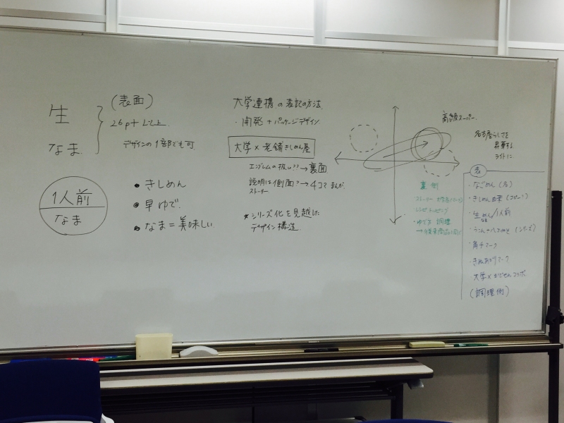 前回の更新から自分たちの商品を持ちこみ、協力してもらえそうな企業を探しました。その結果、鵜飼先生の力もお借りして角千本店といううどん屋に協力を得るようお願いすることになりました。